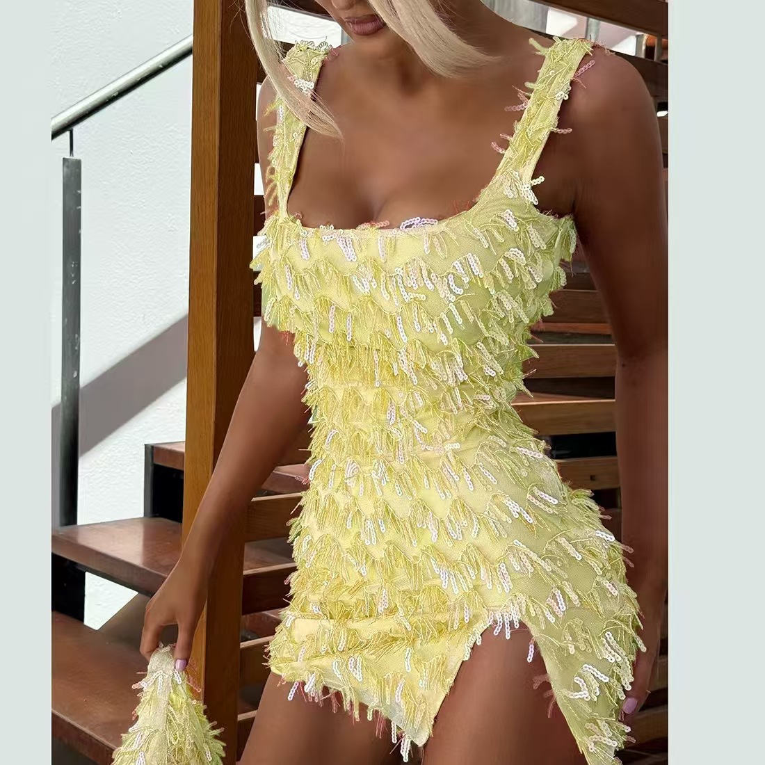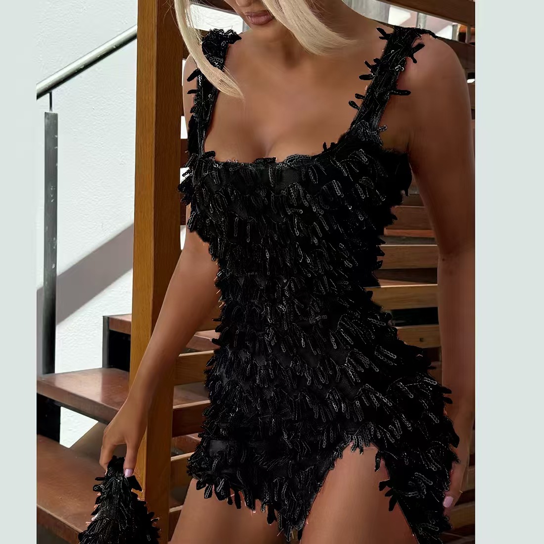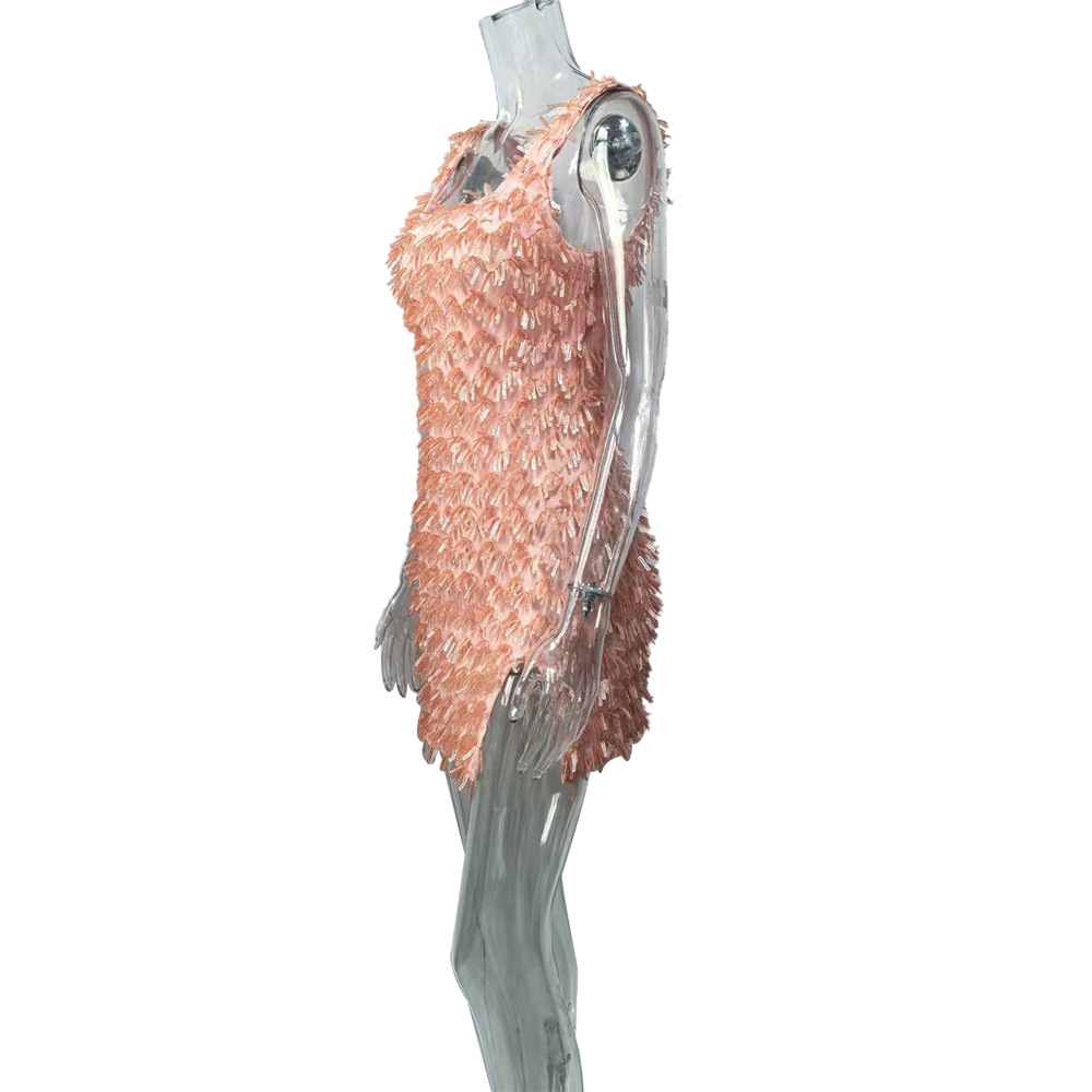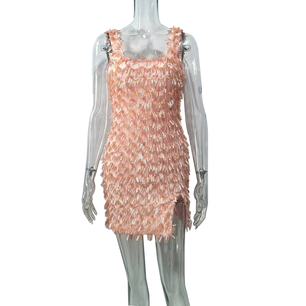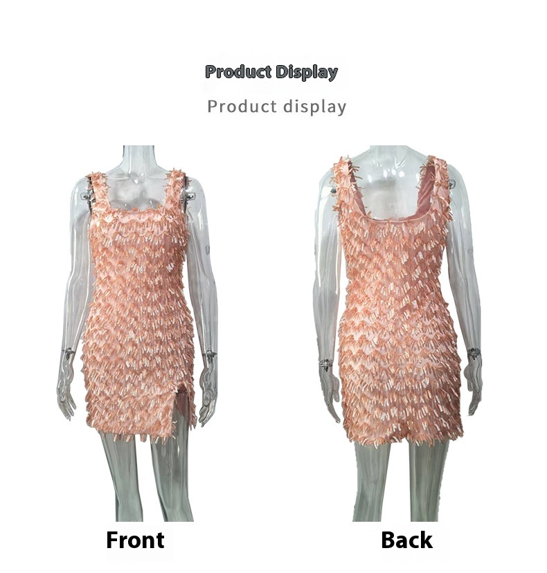 Off-the-shoulder Strap Hip Skirt Split Furry Dress